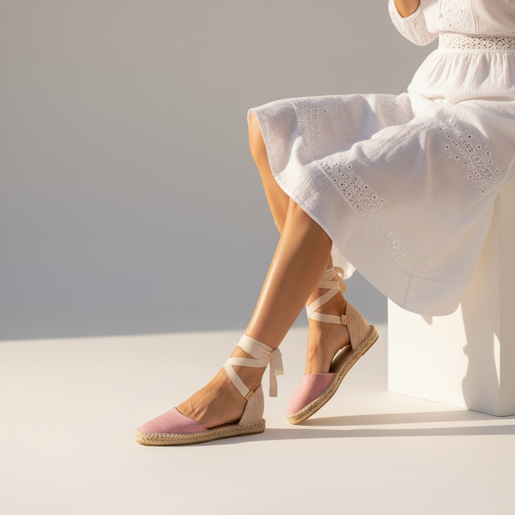 Todo comienza con el tejido de la suela, elaborado a partir de cuerda de yute 100% natural, trenzada y cosida en espiral con maquinaria tradicional o incluso a mano en algunos modelos. Esta base firme pero flexible es la esencia de la alpargata, y se refuerza con una fina capa de caucho natural para hacerla más duradera y antideslizante.