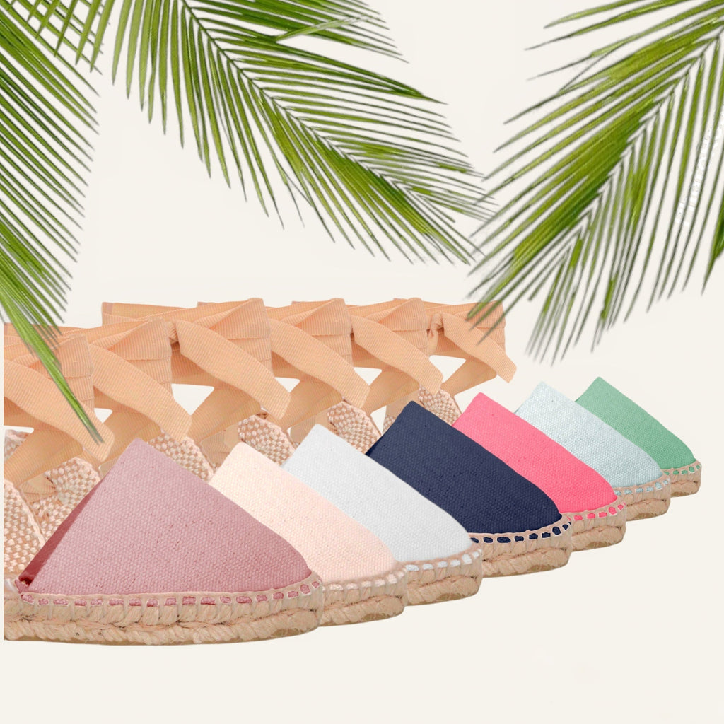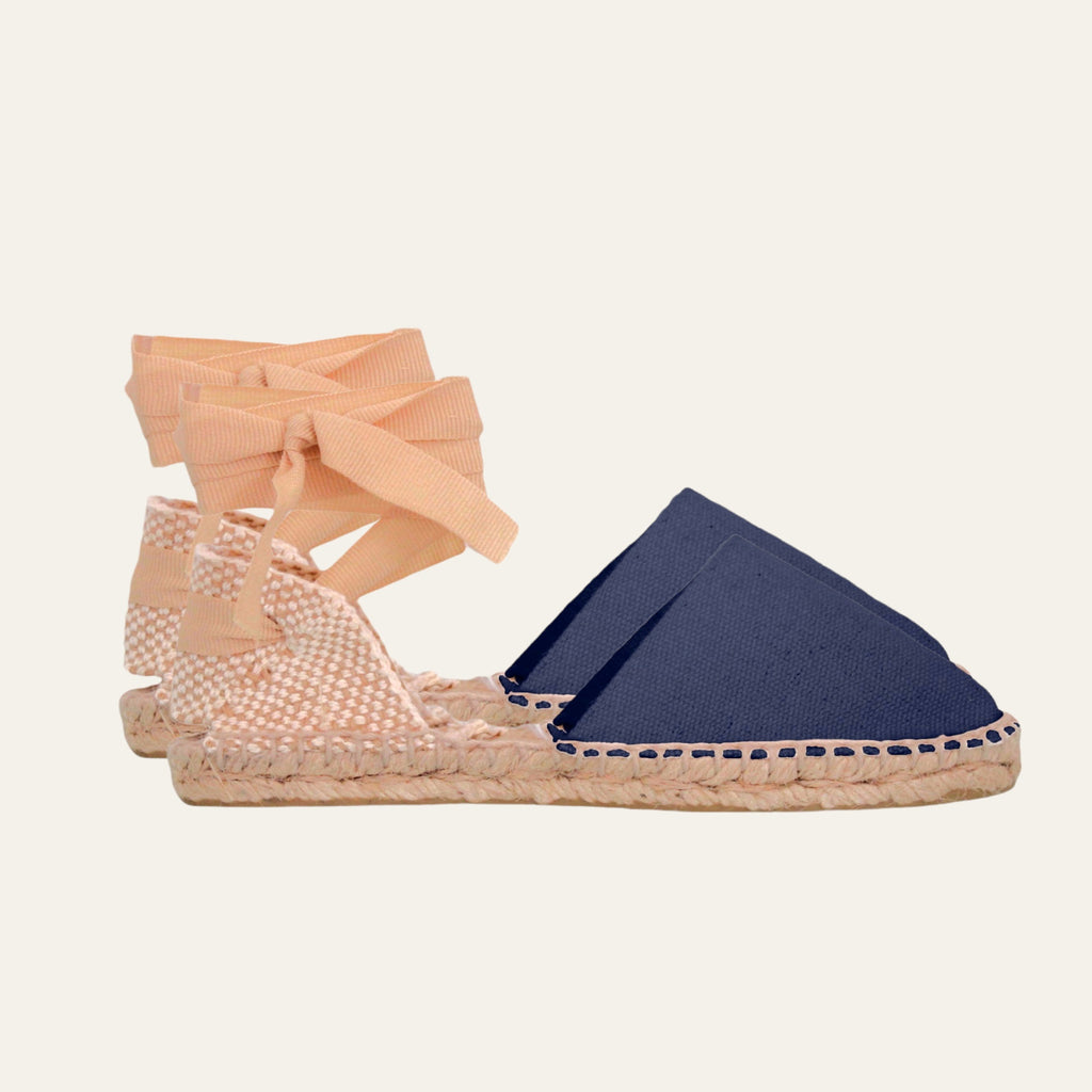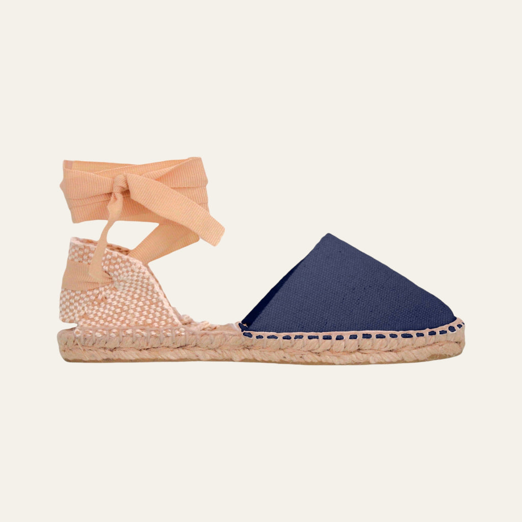 Made of navy blue canvas with 2 pairs of Ivory and Sand ribbons so you can exchange them.
