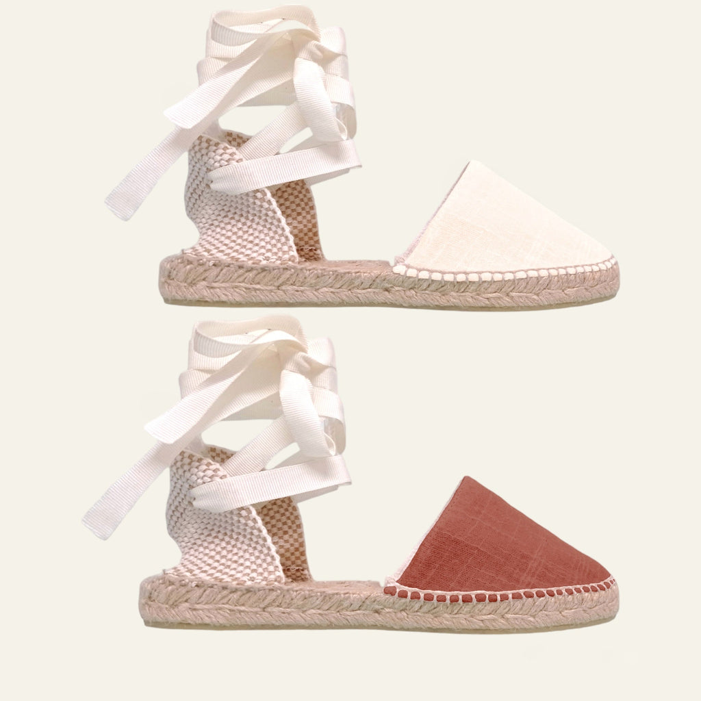 Alpargatas planas de lino con dos pares de cintas intercambiables, un calzado cómodo y versátil para cualquier ocasión. Estas alpargatas están fabricadas con lino y algodón de alta calidad, lo que las hace ligeras y transpirables, ideales para usar durante largas horas en climas cálidos.
