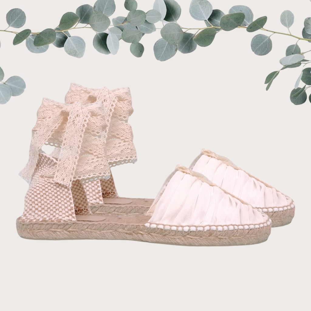 Las alpargatas de tul marfil y encaje con cintas son un elegante y cómodo calzado para las que buscan un estilo vintage romántico.