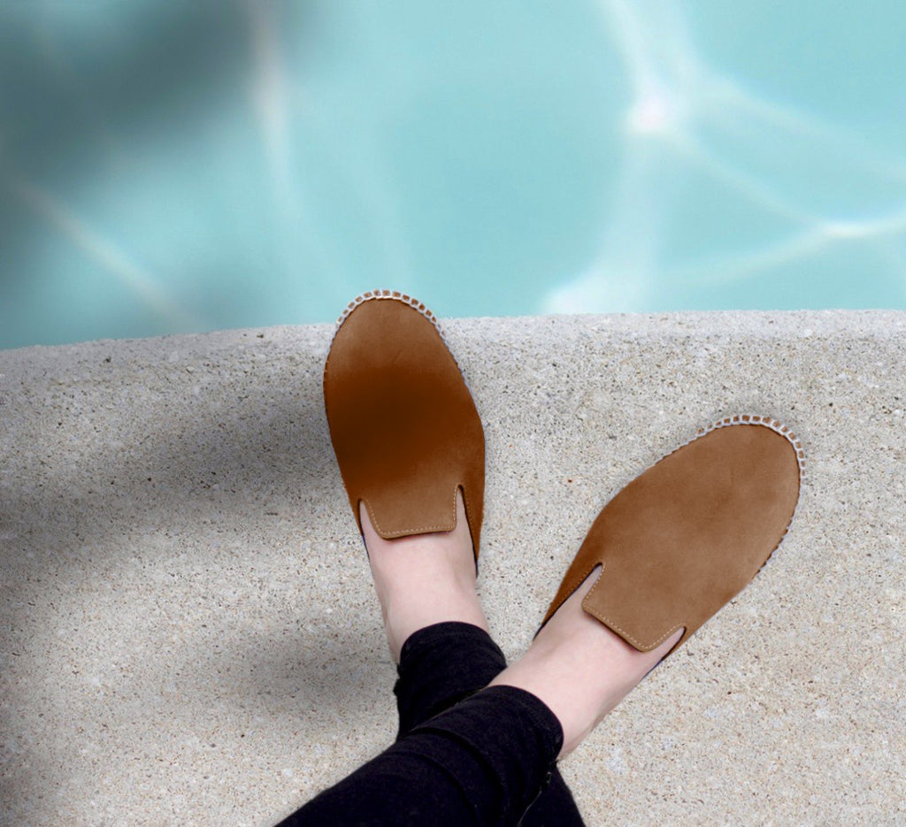 Realizado en ante de cuero muy suave de color marrón terra, un color muy natural que combina con cualquier estilo.