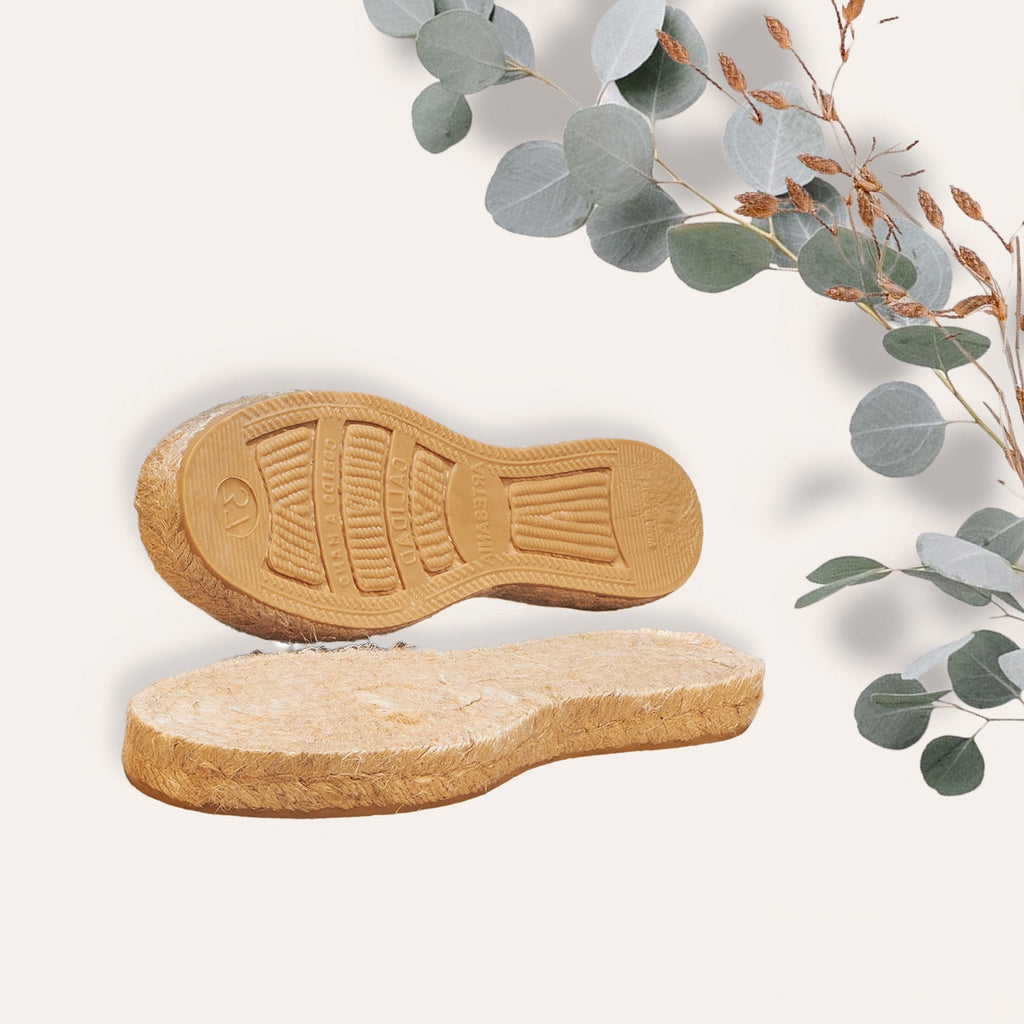 Las suelas están vulcanizadas y no pegadas que les aporta una gran flexibilidad por lo que nunca tendrás el problema de que se despeguen. Son 100% naturales fabricadas en fibras de yute biodegradables y caucho natural que dejan respirar tus pies. El caucho natural es un excelente antideslizante que proporcionan una base ideal tanto para dentro, como para fuera de casa por lo que las puedes usar en tus paseos sin tener miedo de que se estropeen o de que te resbales.
